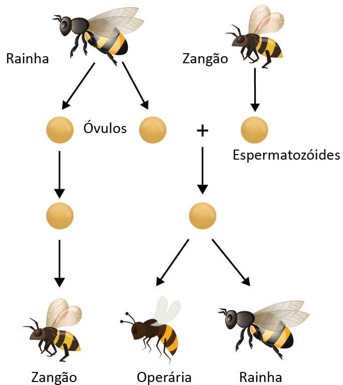 Em abelhas (Gênero Apis), as rainhas (fêmeas férteis) e as operárias (fêmeas estéreis) desenvolvem-se a partir de óvulos fecundados(diploides), enquanto os zangões(machos) desenvolvem-se a partir de óvulos não-fecundados(haploides).